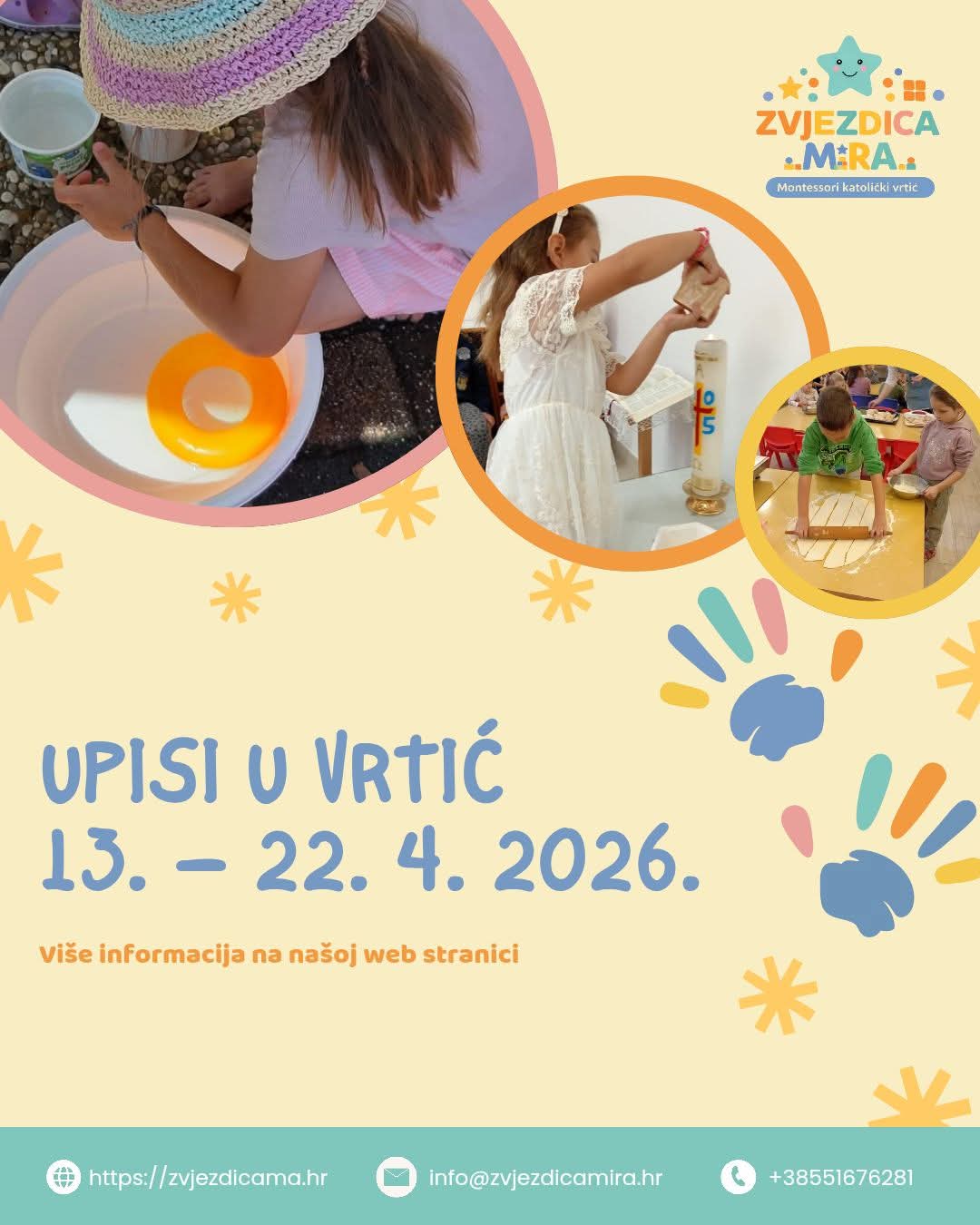 Upisi u Montessori katolički vrtić Zvjezdica mira otvoreni su tijekom cijele godine, ovisno o raspoloživim mjestima. S radošću primamo djecu u 10-satni program u dobi od 3 do 6 godina, u mješovite tri skupine, uz individualan pristup svakom djetetu i blisku suradnju s obitelji.